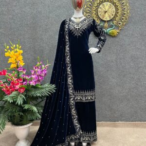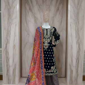Velvet Designer Collection Fancy Heavy Embroidery And Sequence Work Top – Pant With Fancy Dupatta