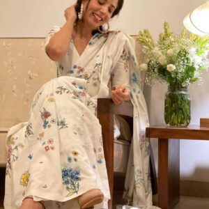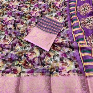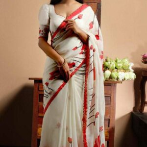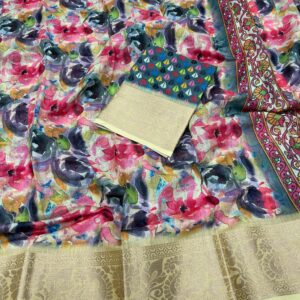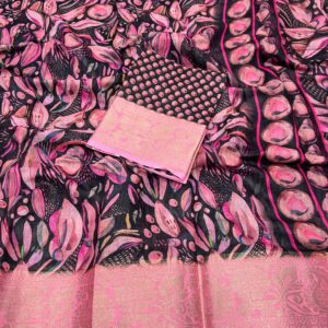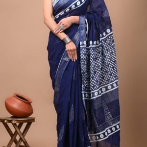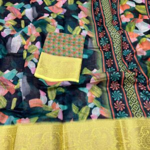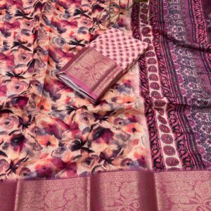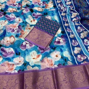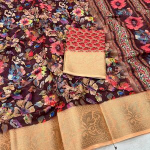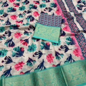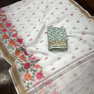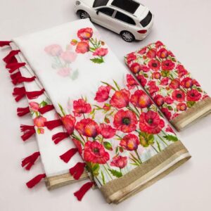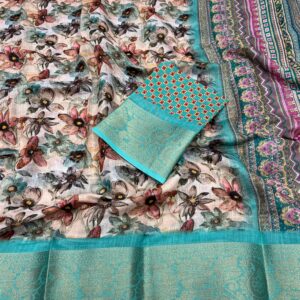 Linen saree with beautiful Digital Printed pallu Silver jari Weaving border
