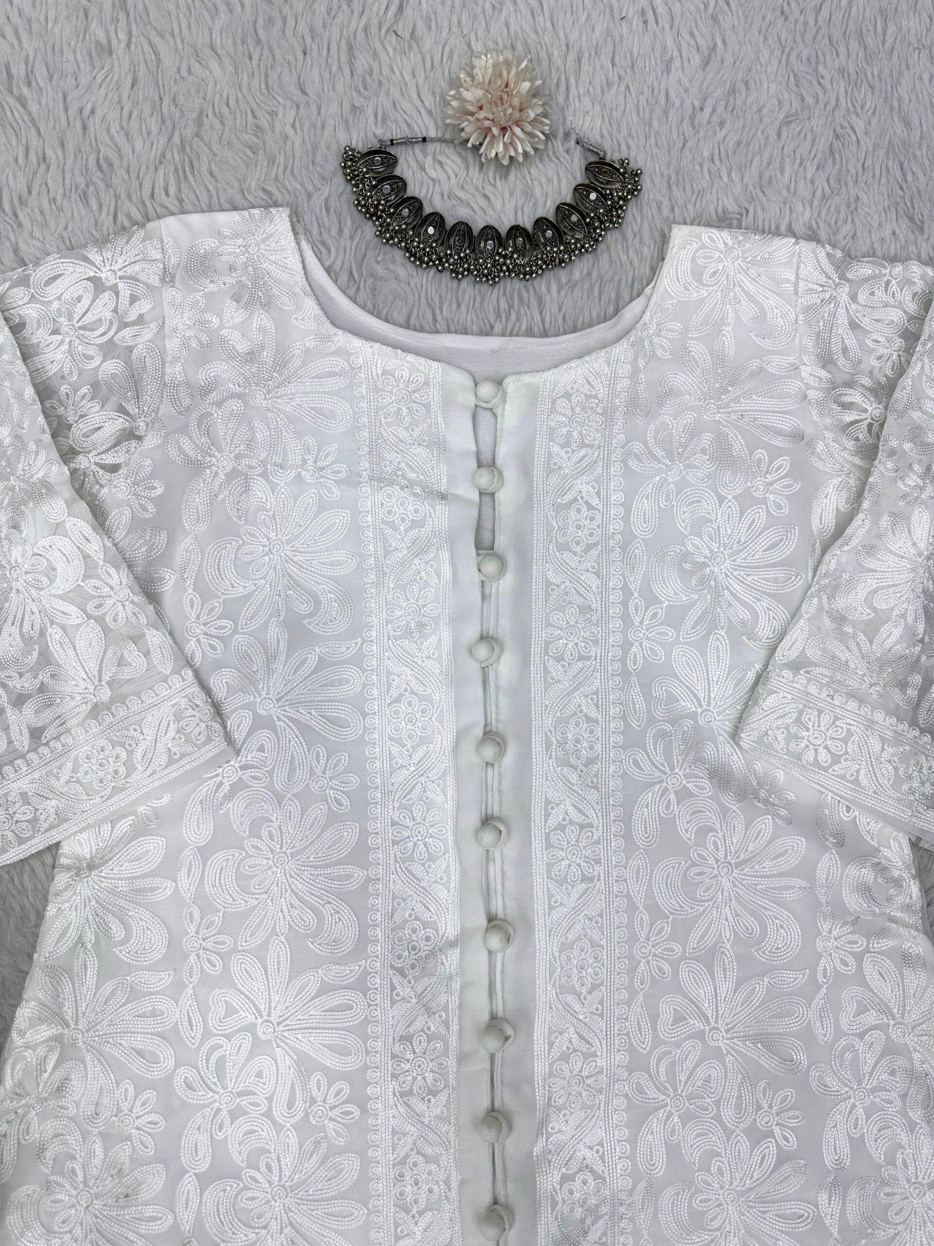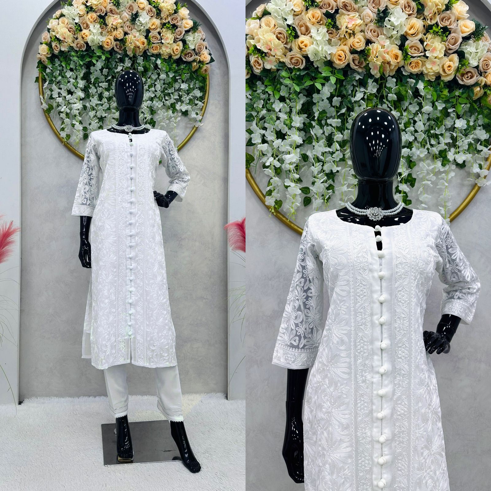 Beautiful Designer Suit On heavy Faux Georgette Fabric with inner and Chain-Stitch work and Pent Crepe Fabric with Lace work.