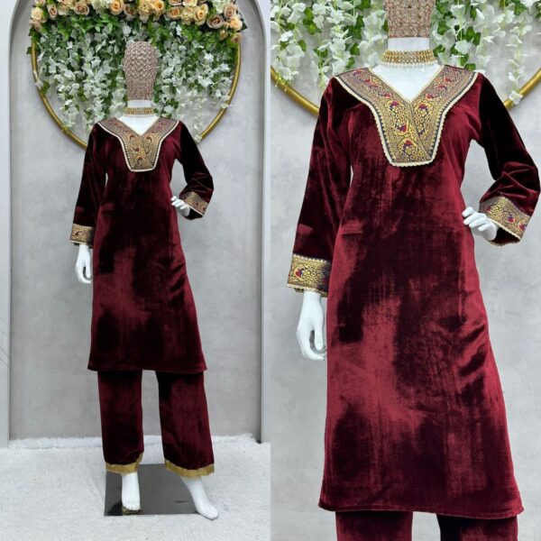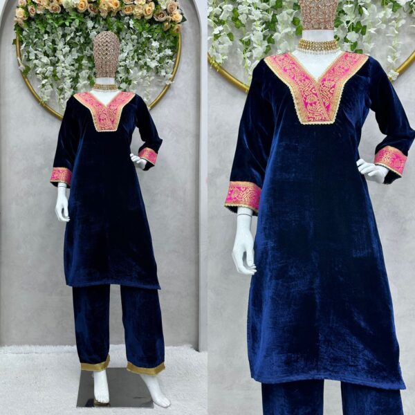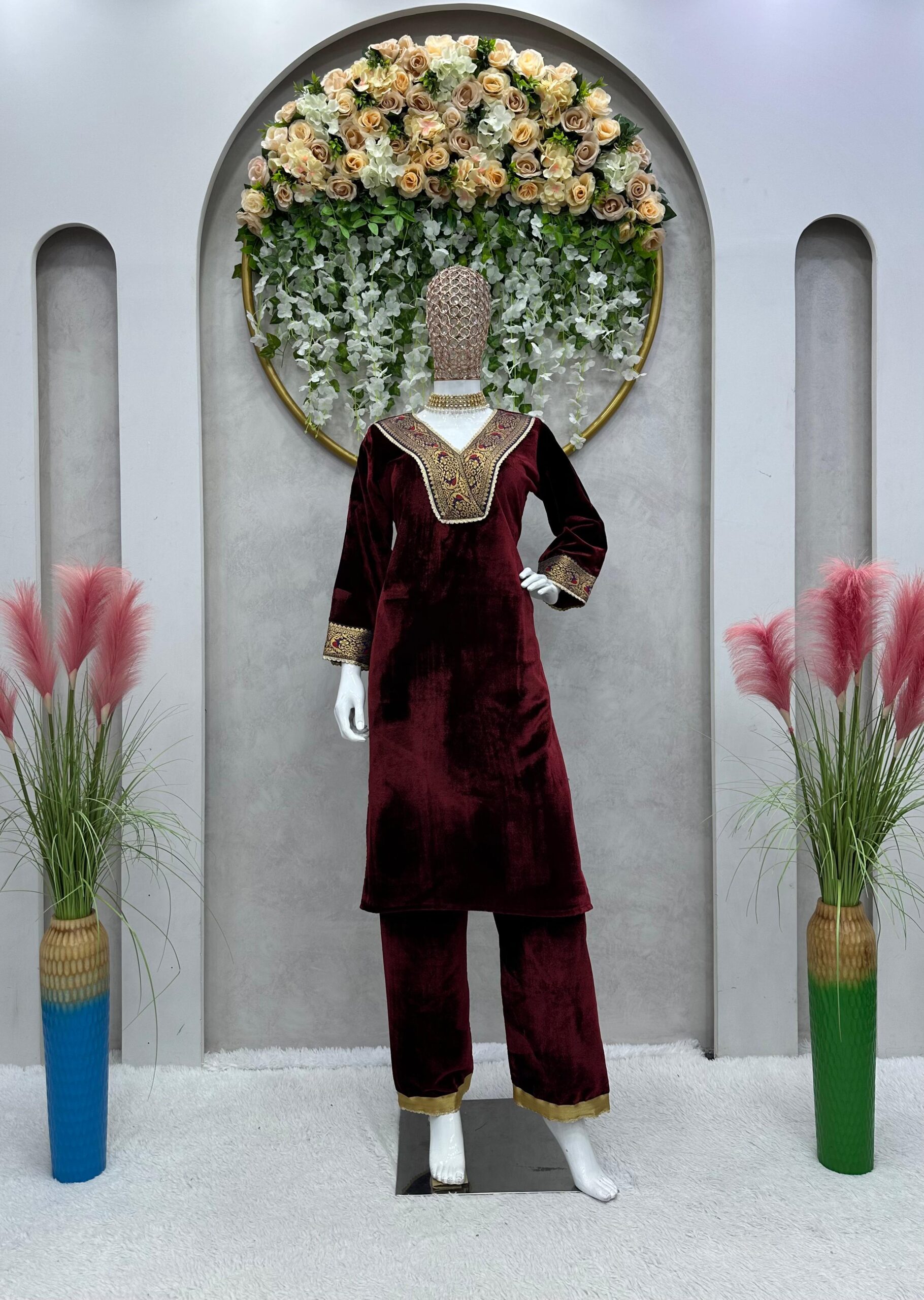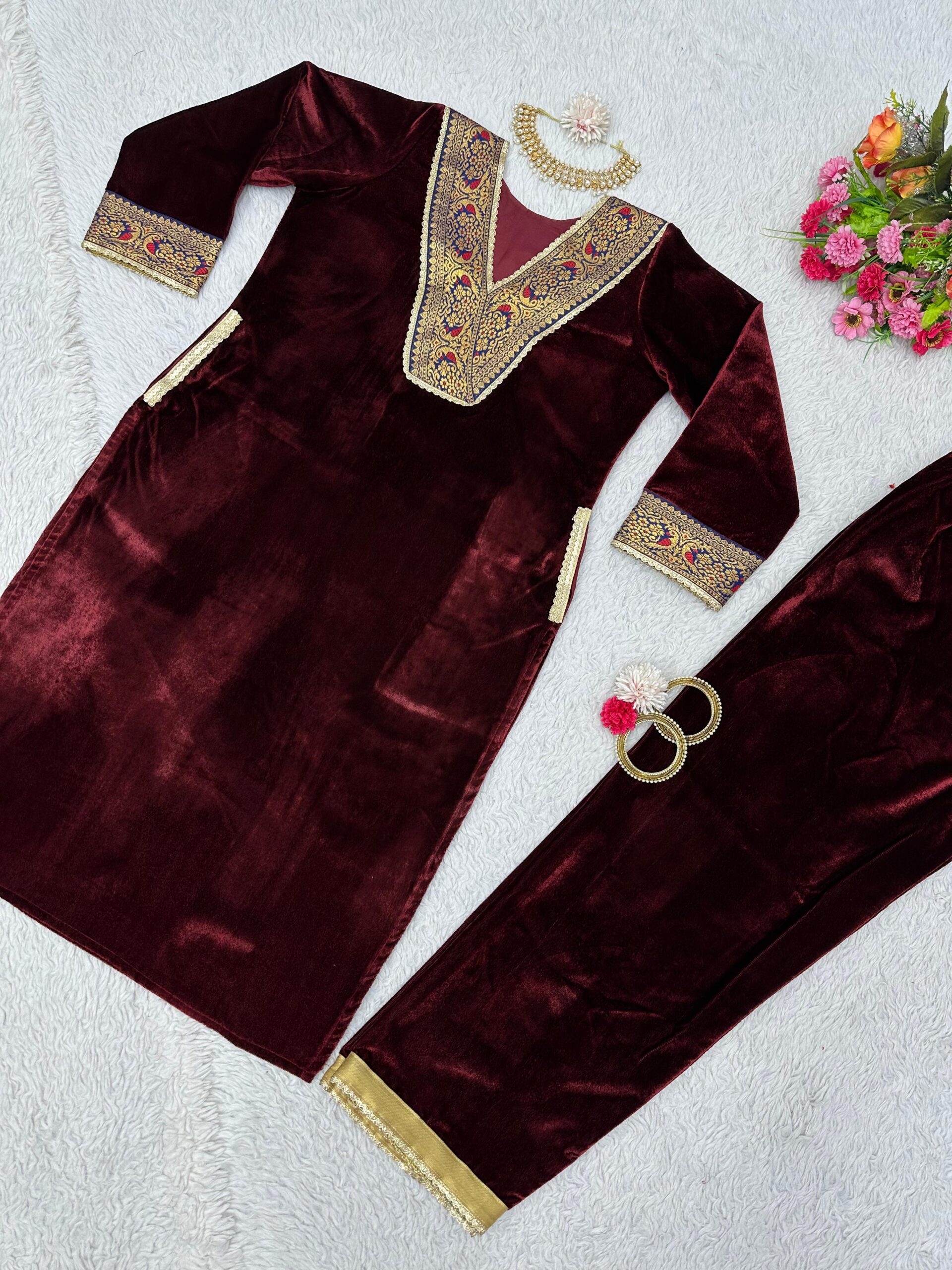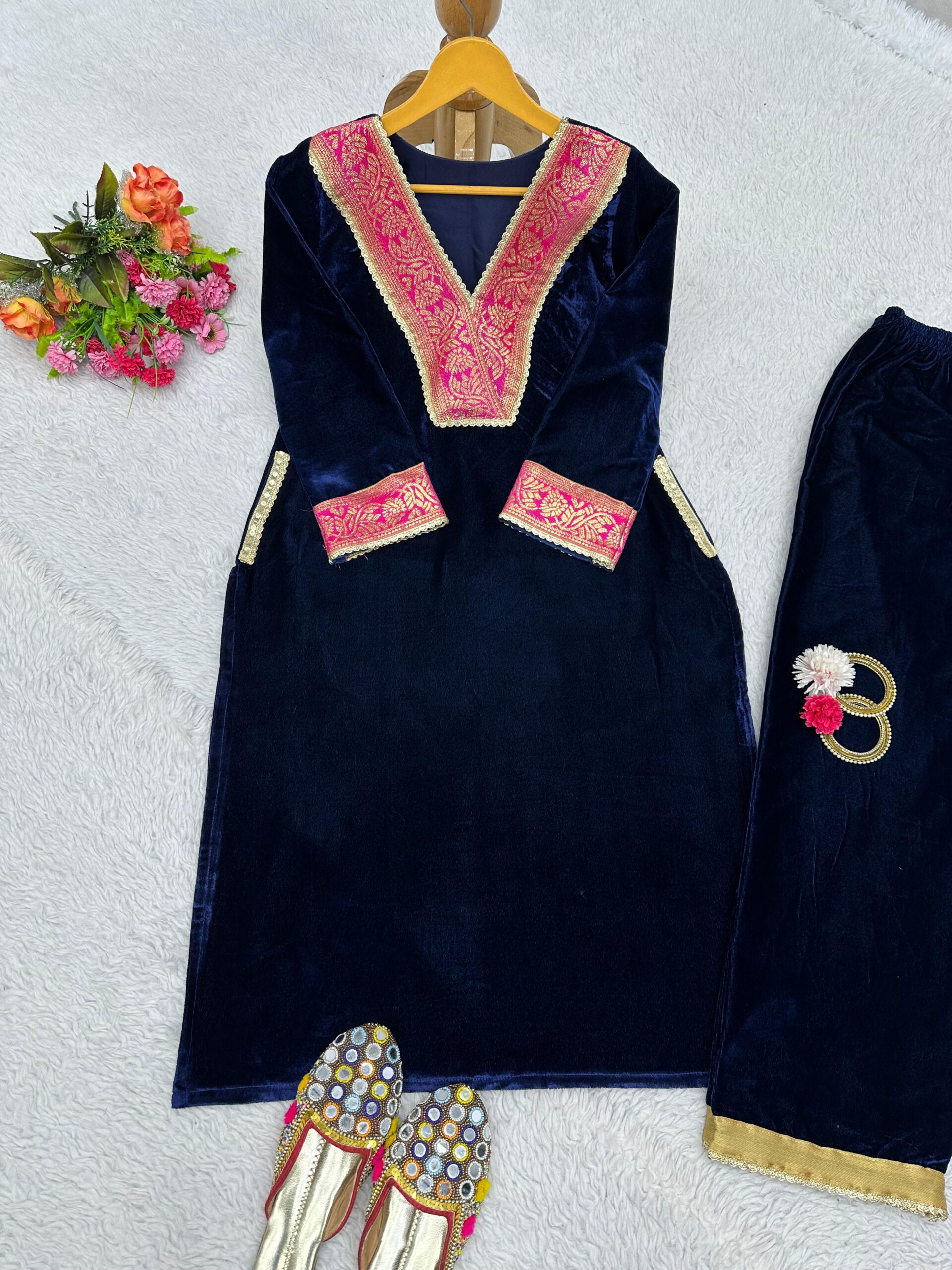 Beautiful Designer Suit On heavy Velvet fabric with inner and Jacquard Lace work and Pant on also Velvet fabric with Fancy Lace.