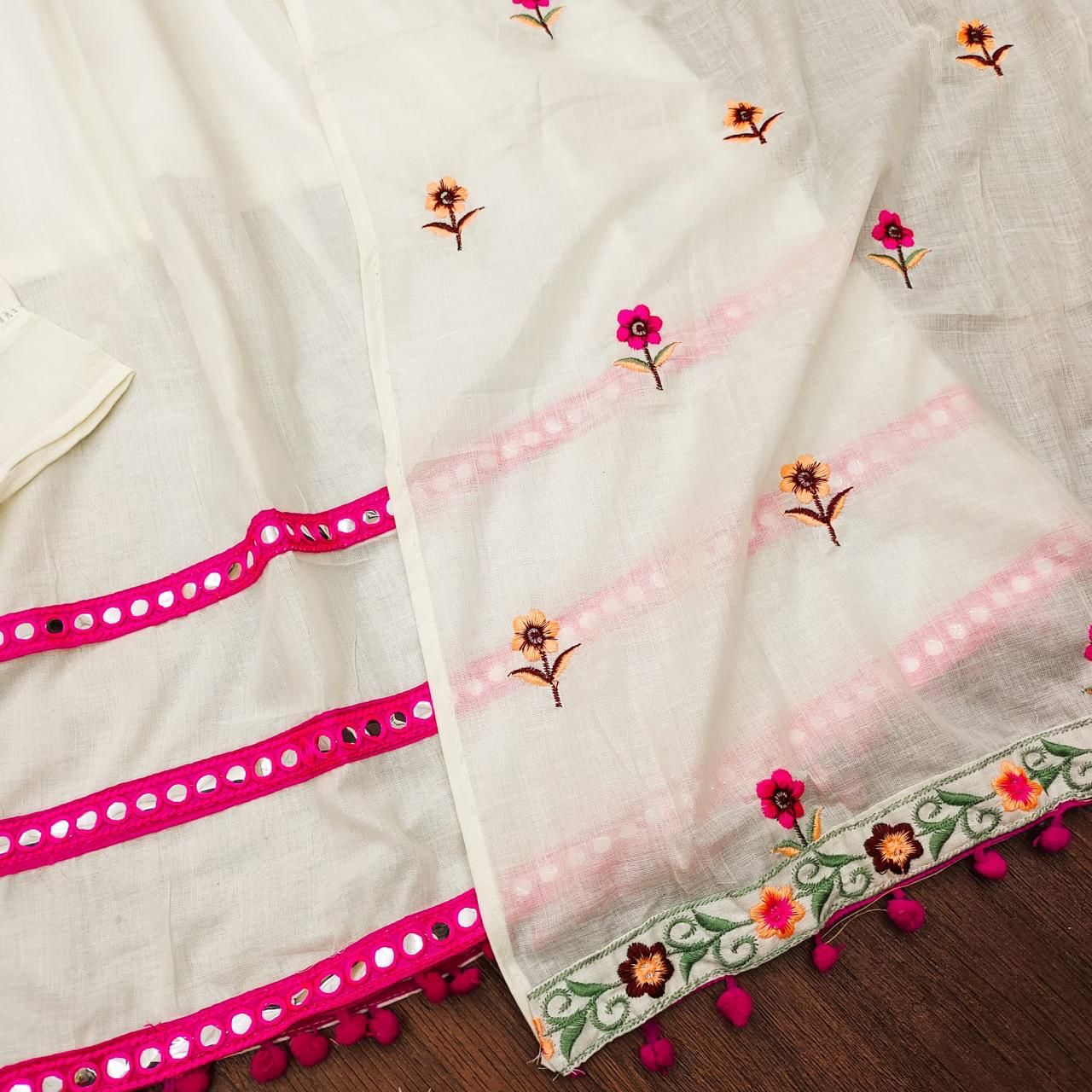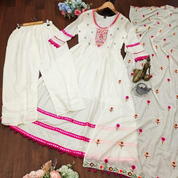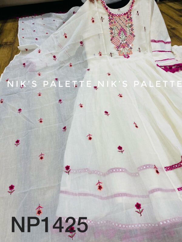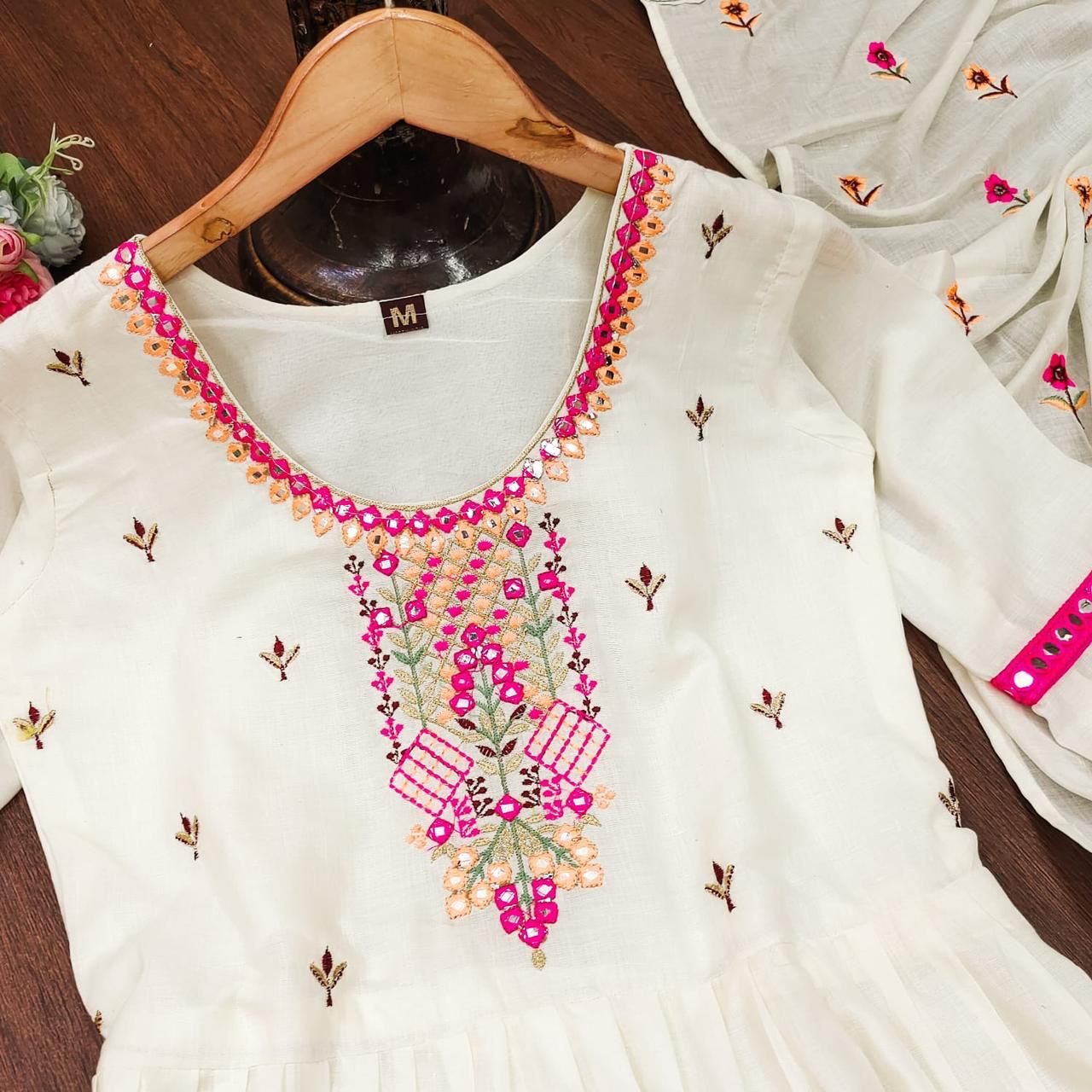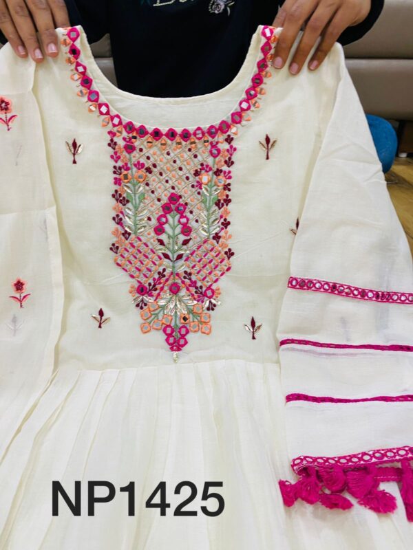 Premium mulmul cotton anarkali kurta with cotton pant having beautiful embroidery and mirror work on yoke detailed with foil mirror and Tussels lace on sleeves and hemline