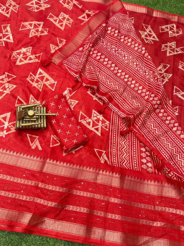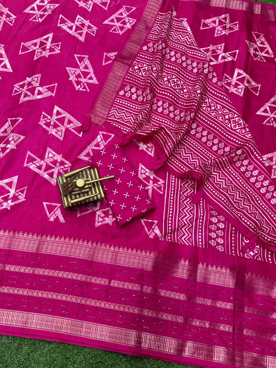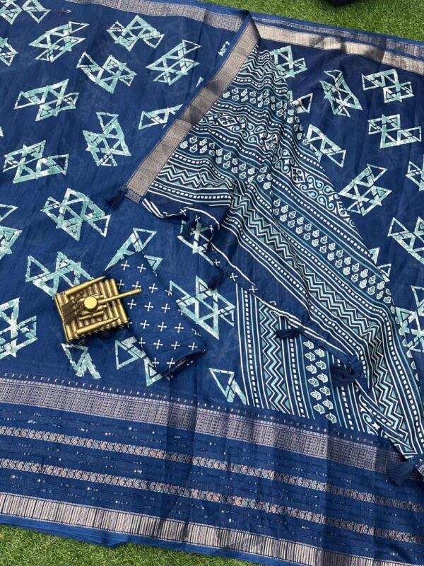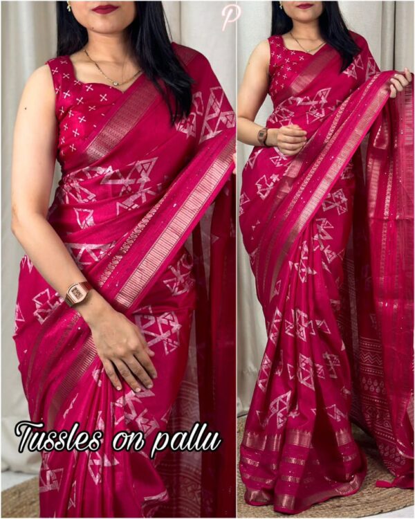 Pattern- Kalamkari print saree with sequence & Zari border & tussles in pallu with printed blouse.