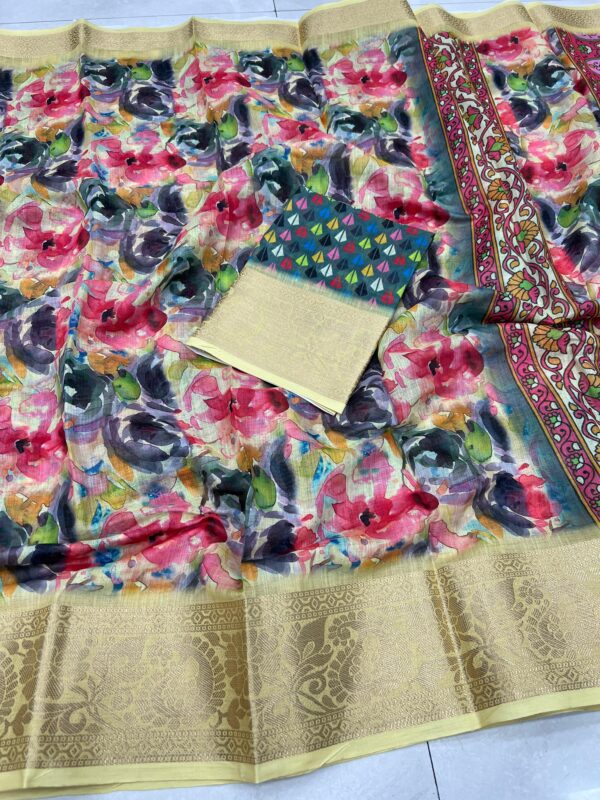 Be the first to review “Linen Digital Print with Golden Jacquard Border Saree”