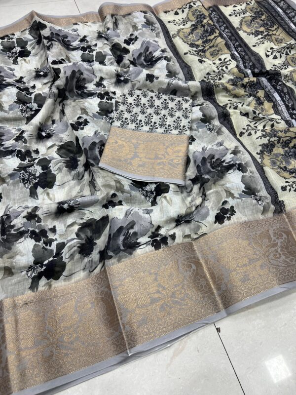 Be the first to review “Linen Digital Print with Golden Jacquard Border Saree”