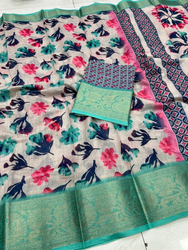 Be the first to review “Linen Digital Print with Golden Jacquard Border Saree”