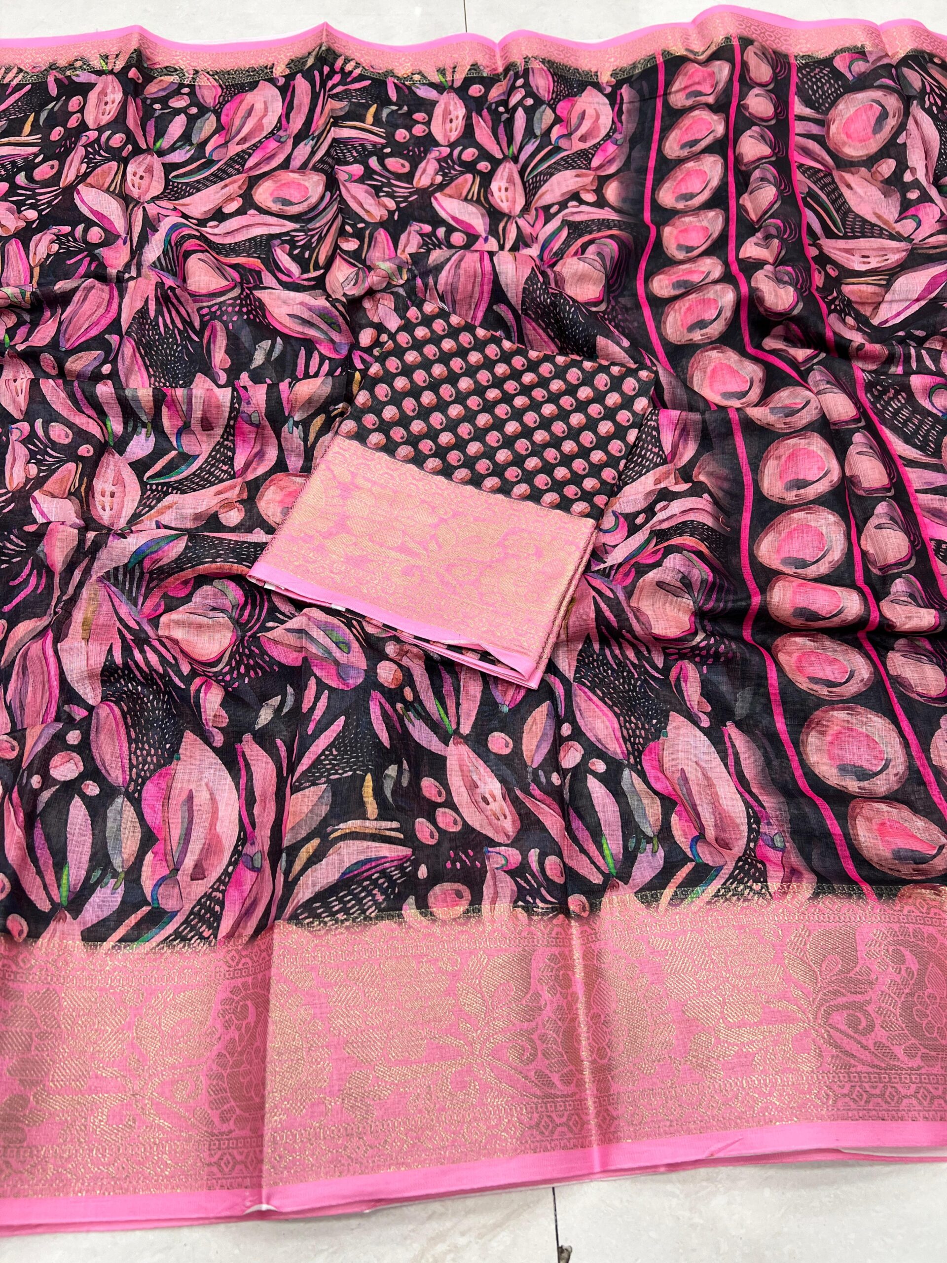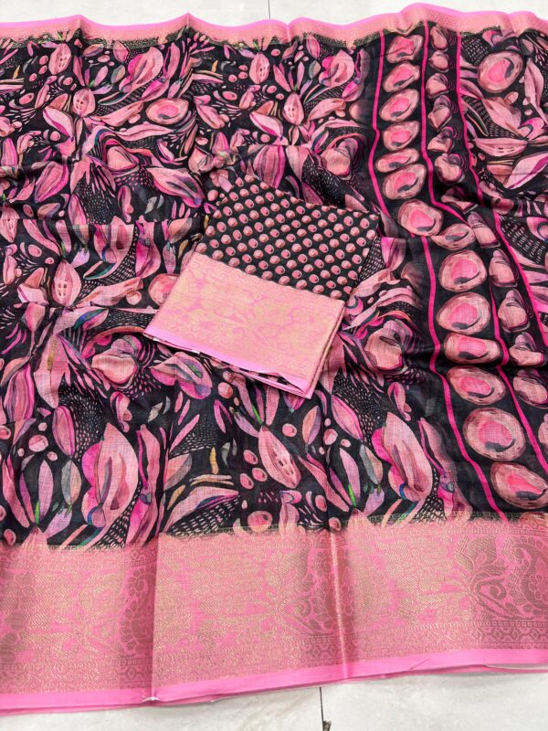Be the first to review “Linen Digital Print with Golden Jacquard Border Saree”