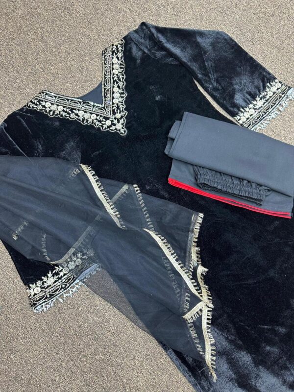 Be the first to review “New Velvet Designer Collection With Fancy Embroidery Sequence Work Top – Bottom With Dupatta”