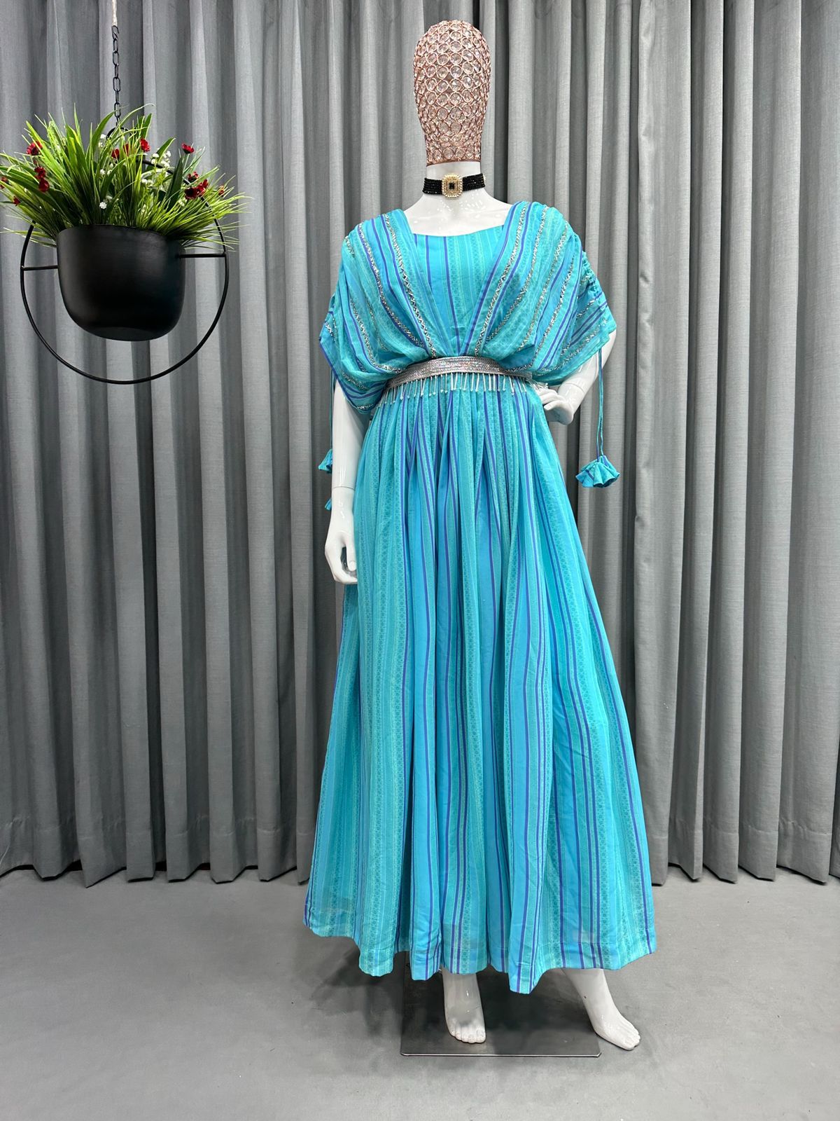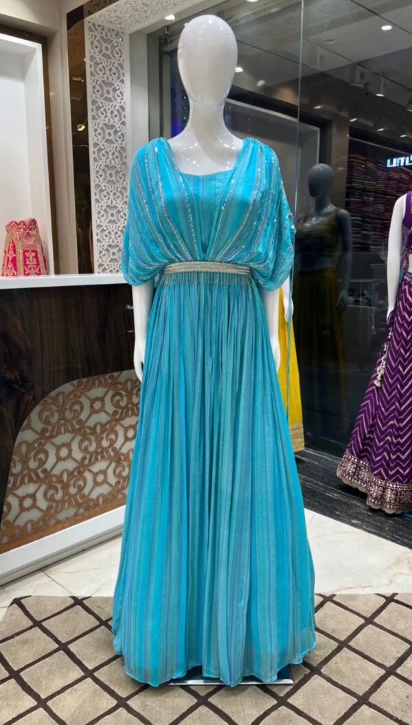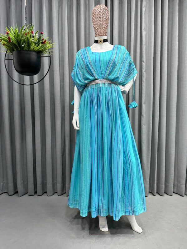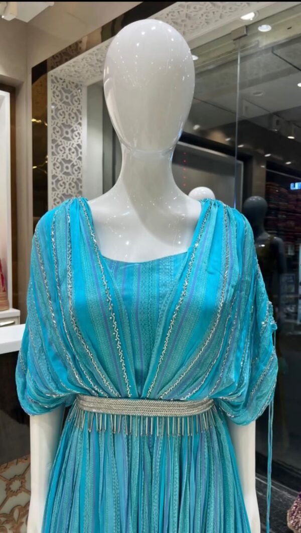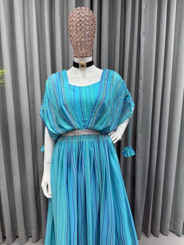 🎗Description 🎗 Looking for this same color beautiful Designer Suit On Faux Georgette Fabric with Hand work and Digital Print with belt and tassels.