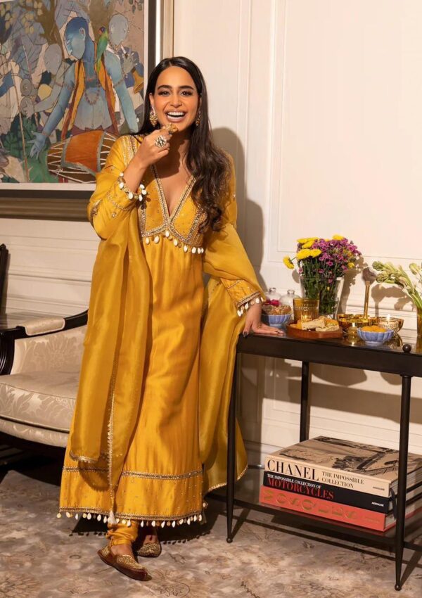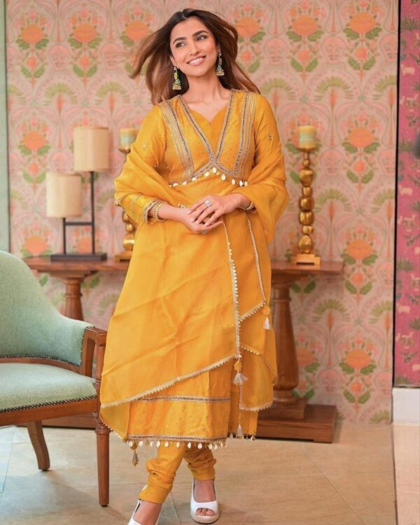 BOLLYWOOD STYLE STAR SAIEE MANJEKAR WEAR RANGOLI SILK SEQUENCE EMBROIDERY WORK TOP WITH CHURIDAR PANT AND DUPATTA