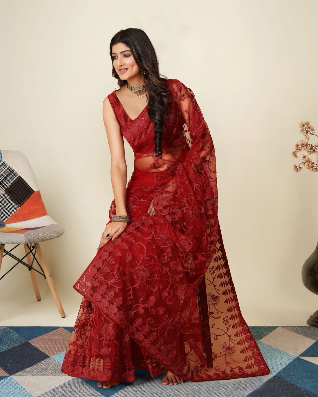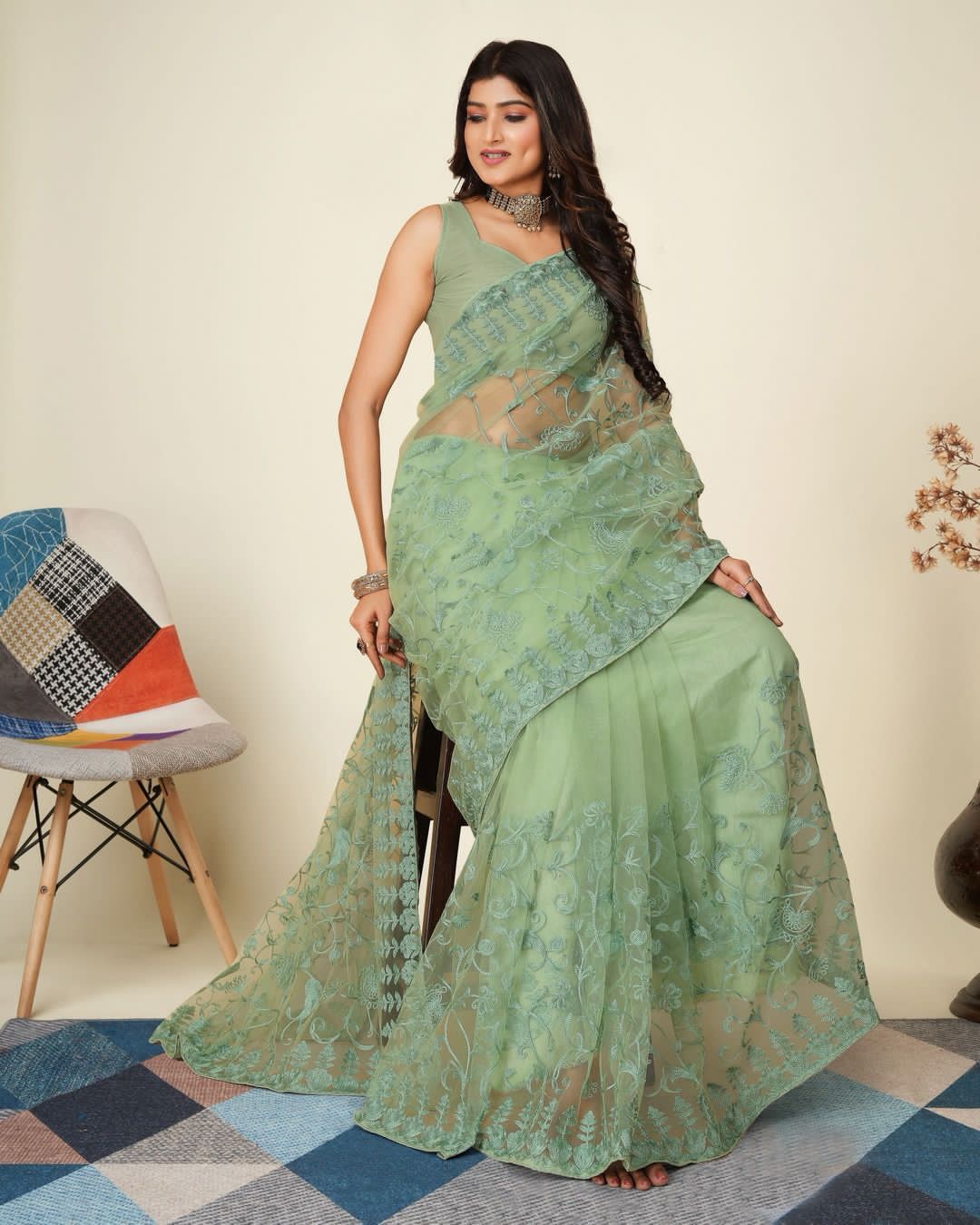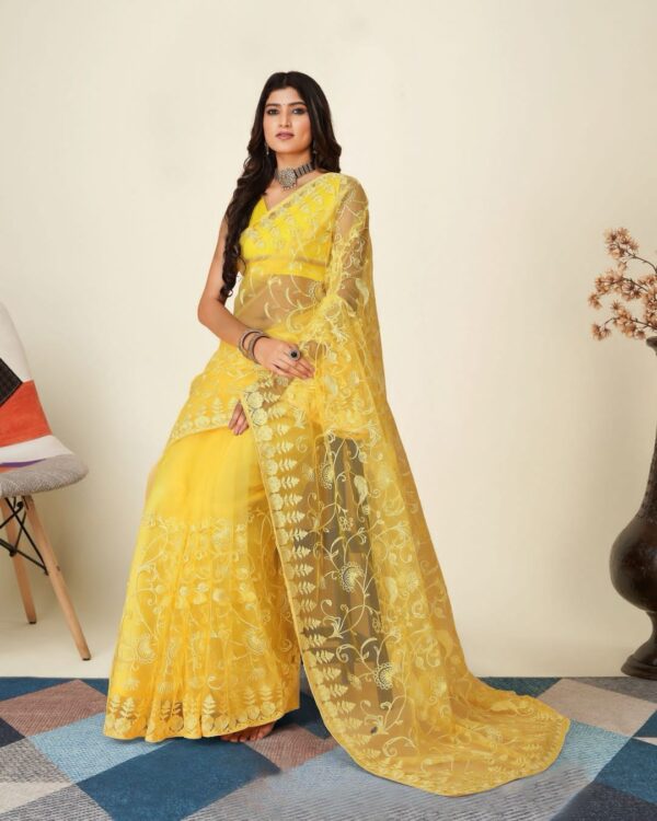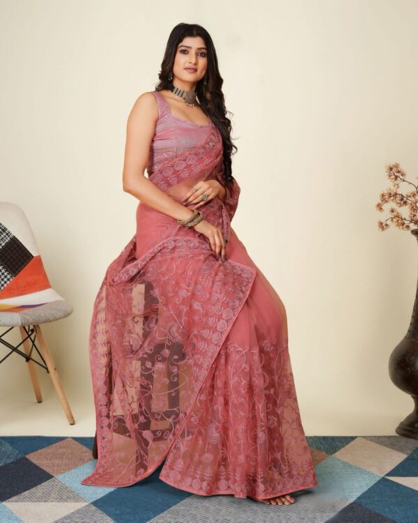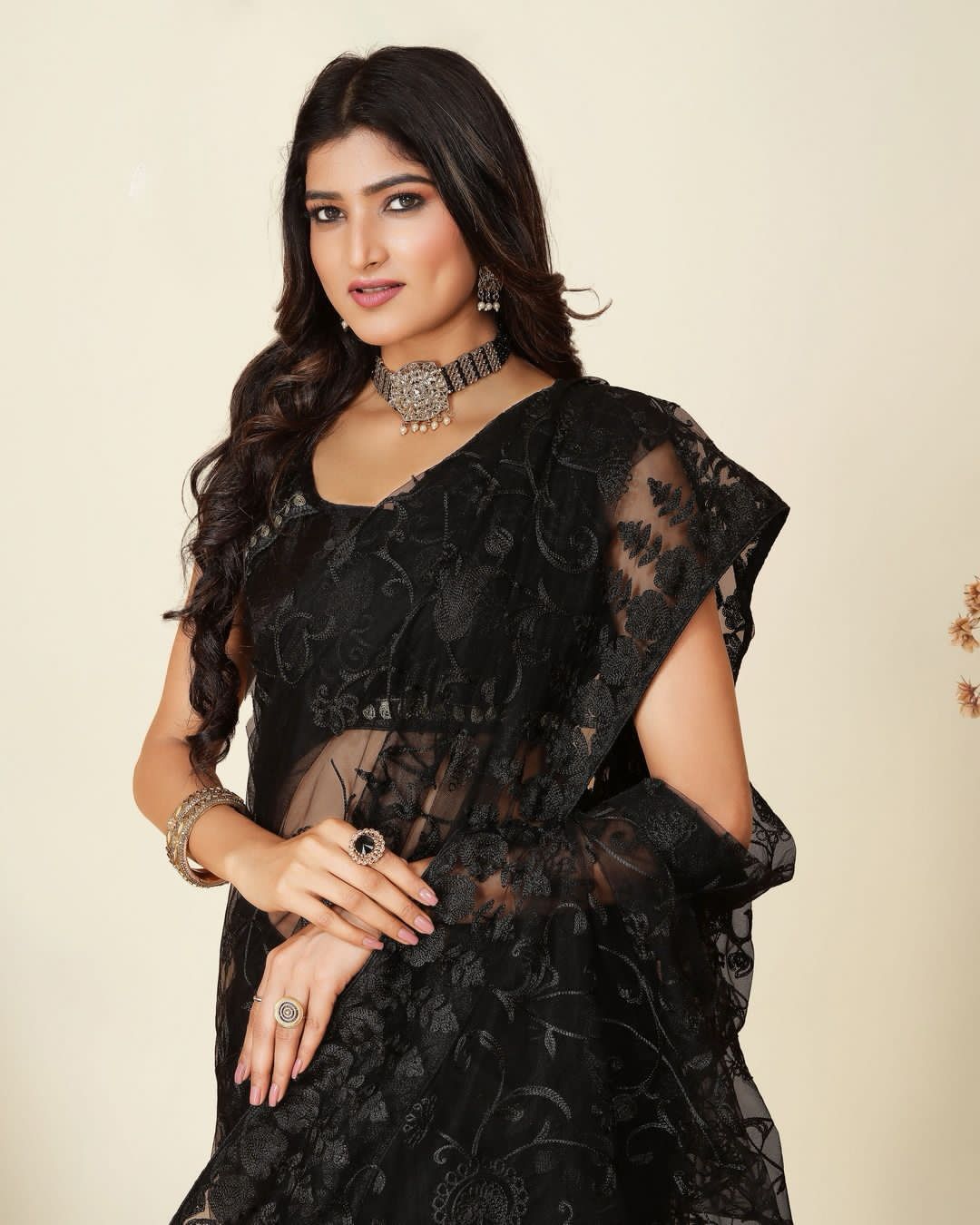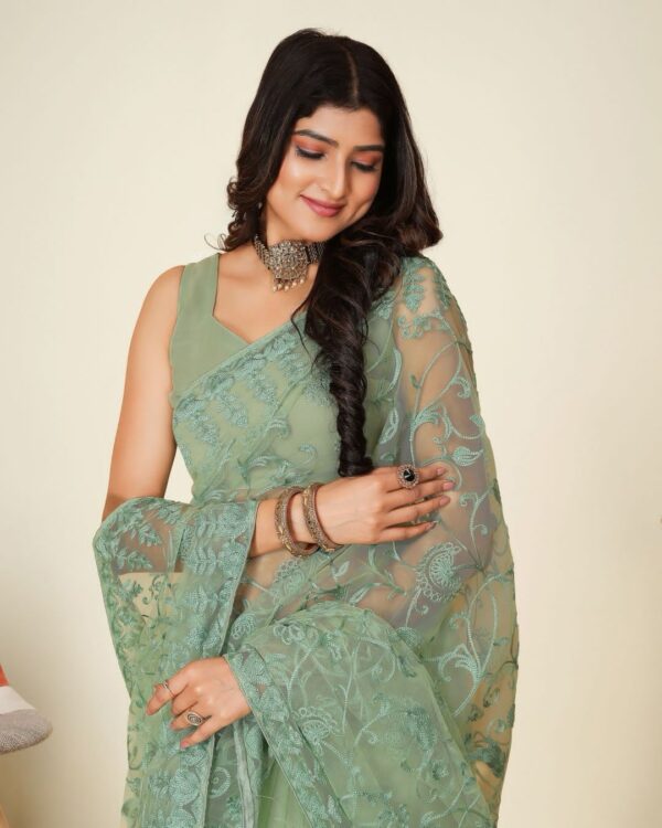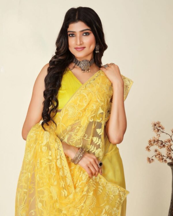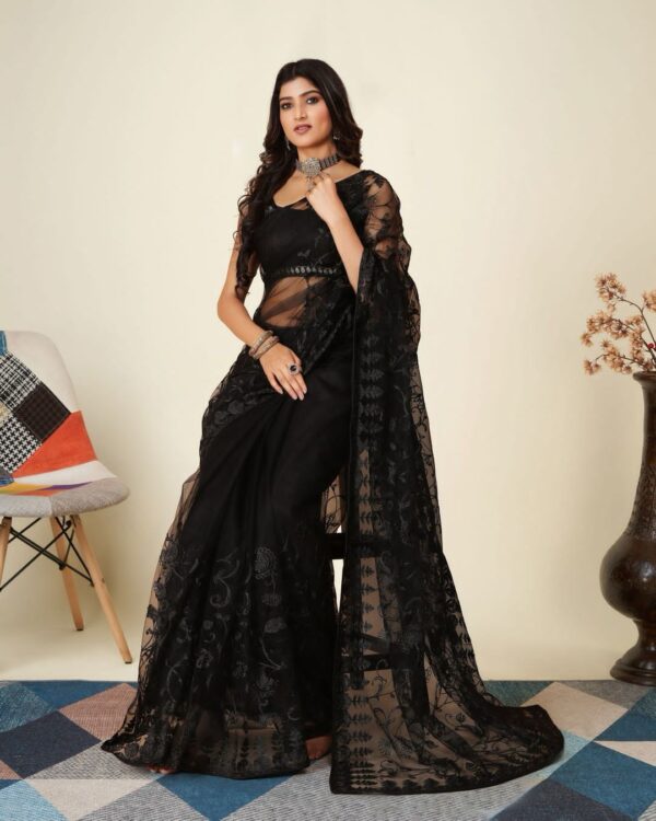Work :-Chikankari Embroidery design Saree with piping border and back lace on saree and blouse also