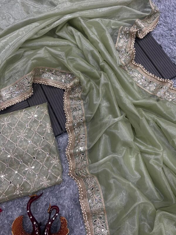 Fabric And Work Details:- Tissue silk Beautiful Sequence and Embroidery work with real hand mirror and pearl lace border