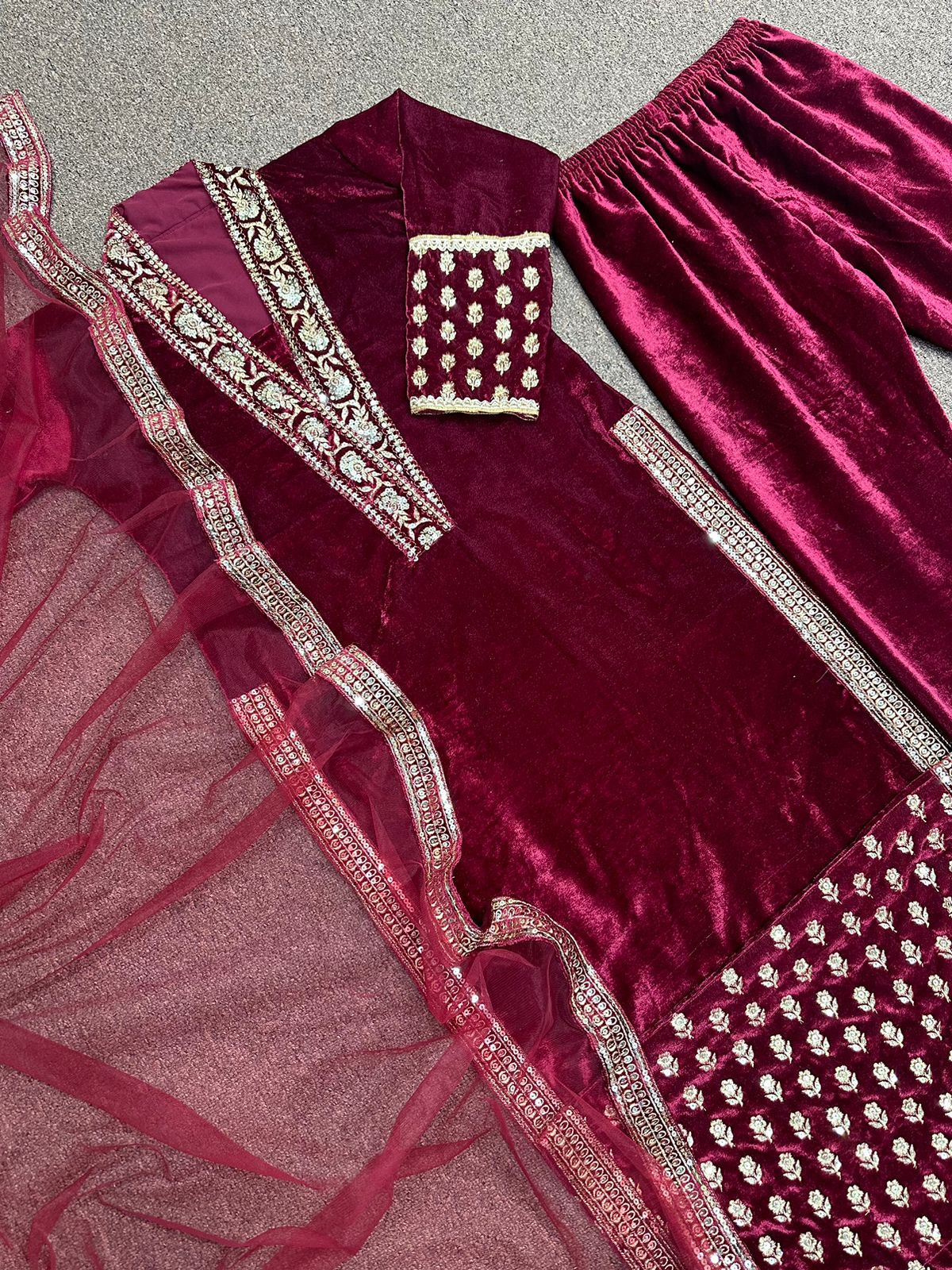 👉❤️PRESERNTING NEW WINTER COLLECTION VELVET SUIT IN EMBROIDERY 5mm SEQUENCE WORK LONG TOP-BOTTOM WITH DUPATTA 👍