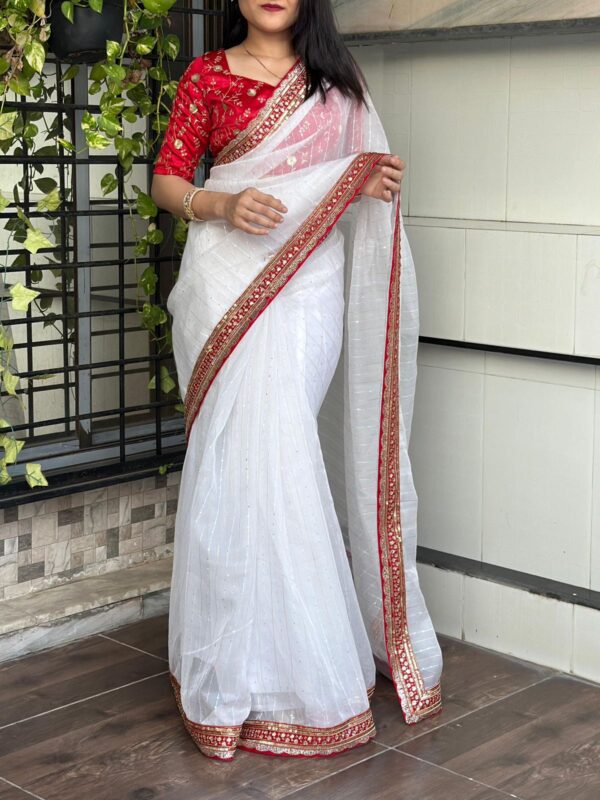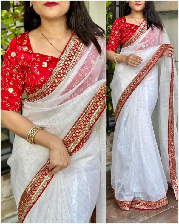 Why blend in when you were born to stand out like a gleaming pearl in a sea of ordinary stones? Our white organza saree have all,